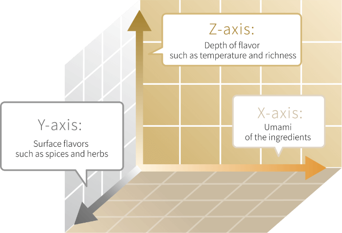 By combining these three axes with the evolving flavors experienced during chewing, we design taste in four dimensions.